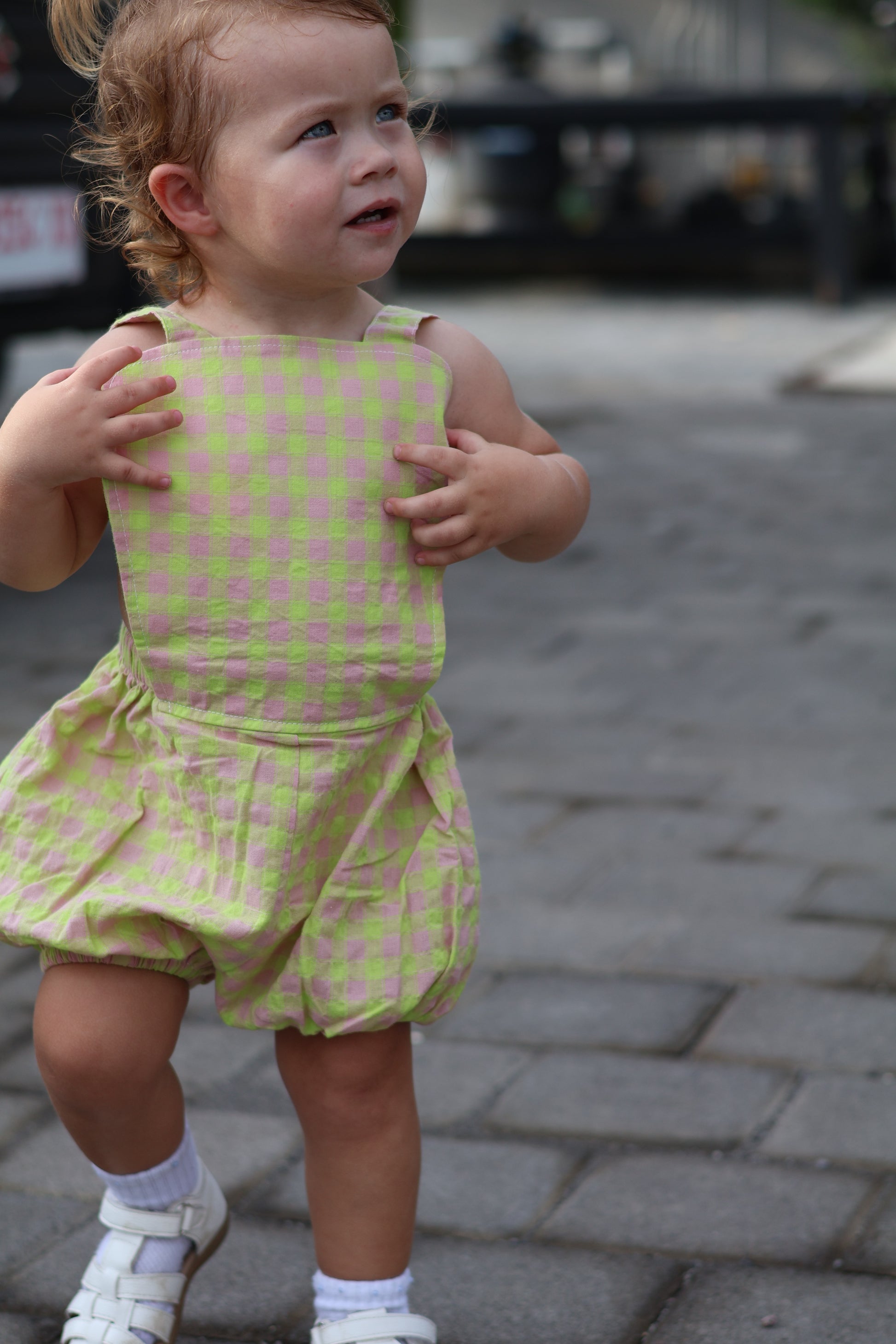 An adorable romper with an adjustable button strap feature.
